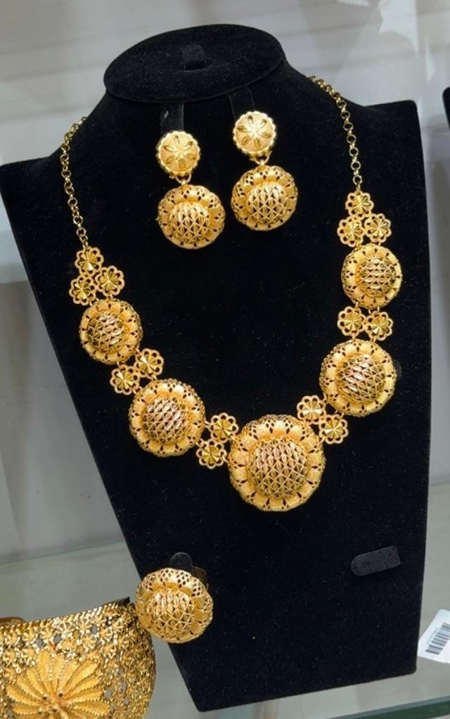 Parure de bijoux fantaisie de couleur dorée.